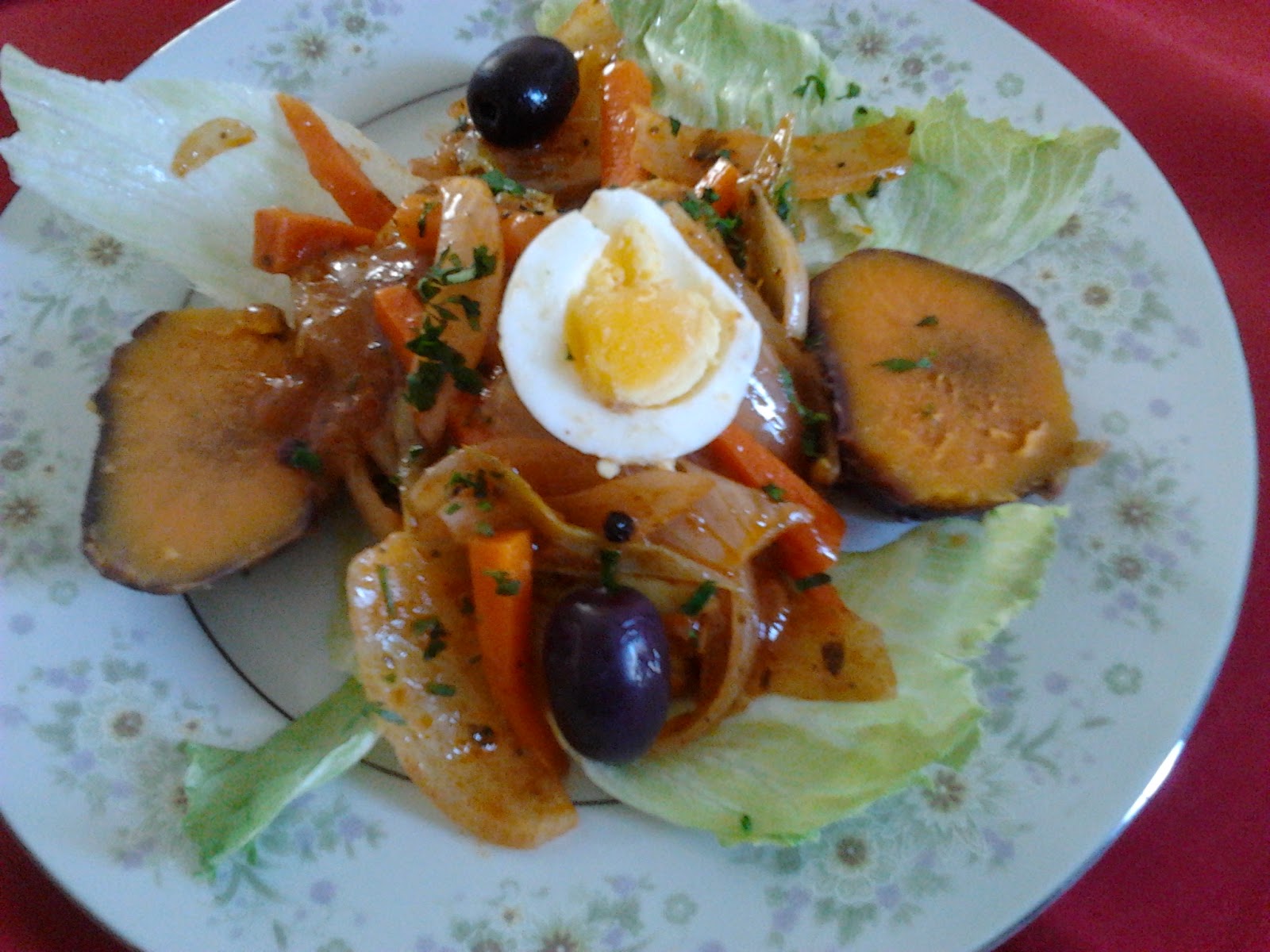 Servir una hoja de lechuga encima una presa de pollo y el aderezo, 2 rodajas de camote, decorar con una rodaja de huevo, aceitunas y perejil picado.